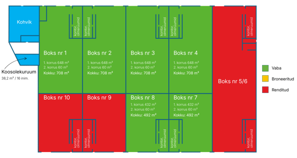 standardse tootmisboksi pindala 432-648 m2 (ruumid kombineeritavad) + igas boksis on kontori- ja olmeruumid 60 m2